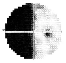 Picture Below. Note that the 30-2 Humphrey Field did not pick up the temporal crescent. This points to the importance of careful confrontation field testing combined with computer testing.